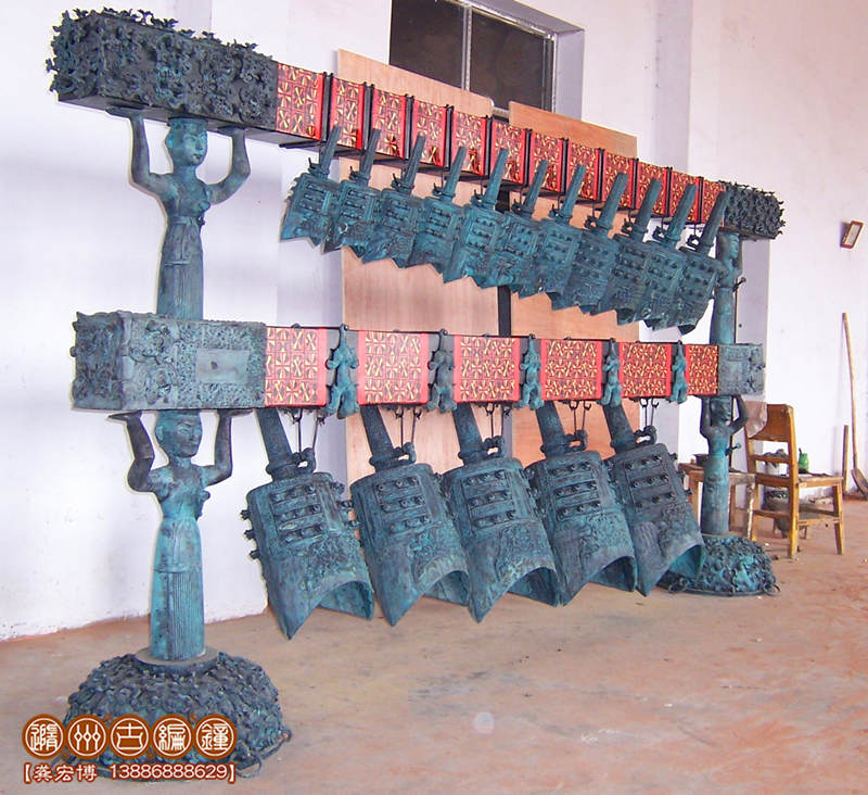 特制16件曾侯乙青銅編鐘,是隨州古編鐘公司應(yīng)美國(guó)客戶的要求,按曾侯乙編鐘設(shè)計(jì)制作的一套特制編鐘,編鐘為青銅鑄造,采用國(guó)際標(biāo)準(zhǔn)樂音音高A=440Hz調(diào)音,可以演奏古今中外樂曲,編鐘大梁采用優(yōu)質(zhì)松木制作,表面噴漆,彩繪花紋。編鐘制作完成后,由公司專人專車配送到美國(guó)客戶位于中國(guó)珠海的公司陳列。這位美國(guó)客戶非常喜歡中國(guó)文化,曾多次到公司進(jìn)行考察了解,最終在公司定購(gòu)一套特制16件曾侯乙青銅編鐘。