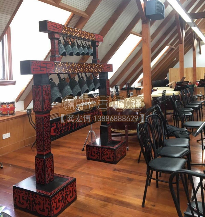 上??蛻舳ㄖ频?2件編鐘長(zhǎng)2米、高2米、寬0.55米,分兩層懸掛了12件青銅編鐘,每件編鐘均可發(fā)出2個(gè)不同的樂(lè)音,半音齊備,采用A=440Hz標(biāo)準(zhǔn)調(diào)音,適合小型民樂(lè)團(tuán)體使用,豐富了民樂(lè)團(tuán)的整體音樂(lè)效果,從而獲得客戶的一致好評(píng)。